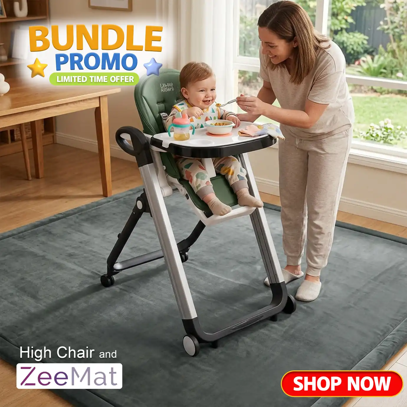 Little Riders Australia Comfort Baby High Chair - Green + ZeeMats Dark Grey (Medium) Bundle
