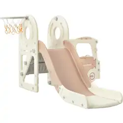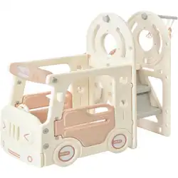 Boys and girls can enjoy this 4-in-1 slide set, featuring a bus-themed play structure, freestanding slide for toddlers, and a basketball hoop for endless entertainment. Simple setup makes it easy to bring the fun to your home.