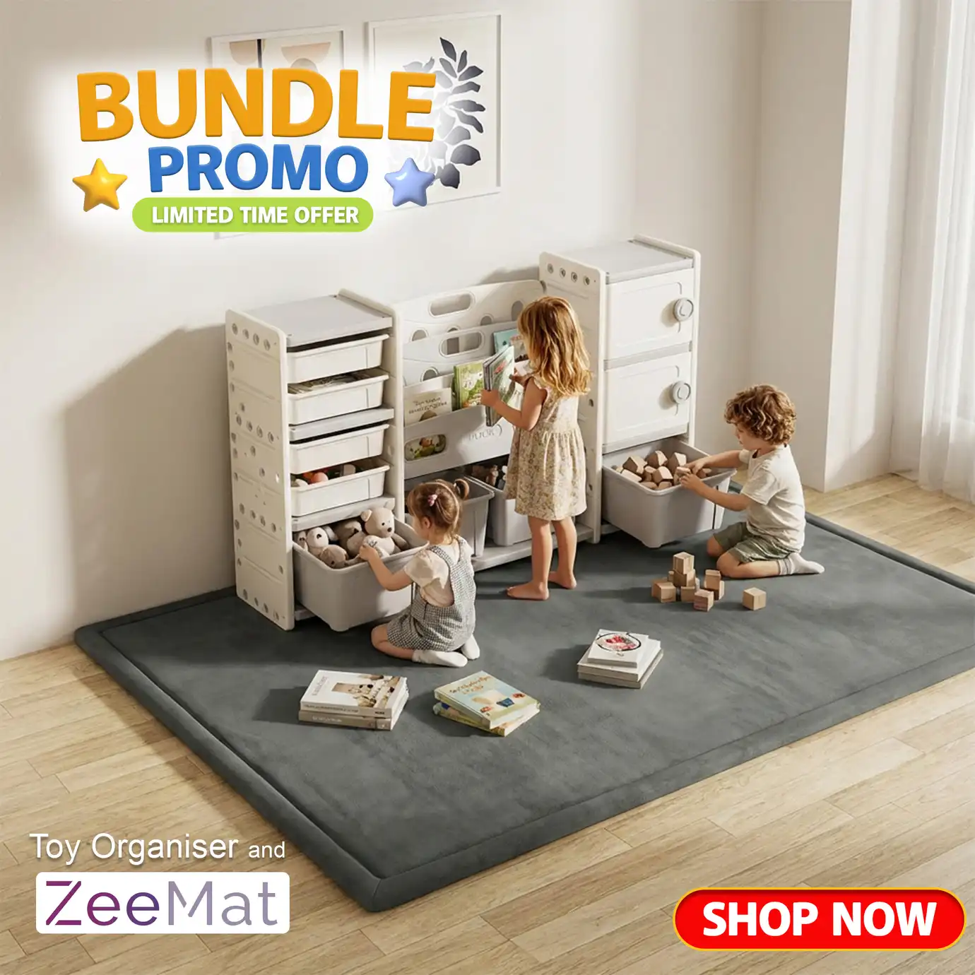 The ZeeMat provides a soft, cushioned 35mm memory foam play surface - perfect to place underneath your toy storage unit. Non-toxic, spill resistant, easy to clean, and non-slip. Protects your floors and keeps little ones safe during playtime.