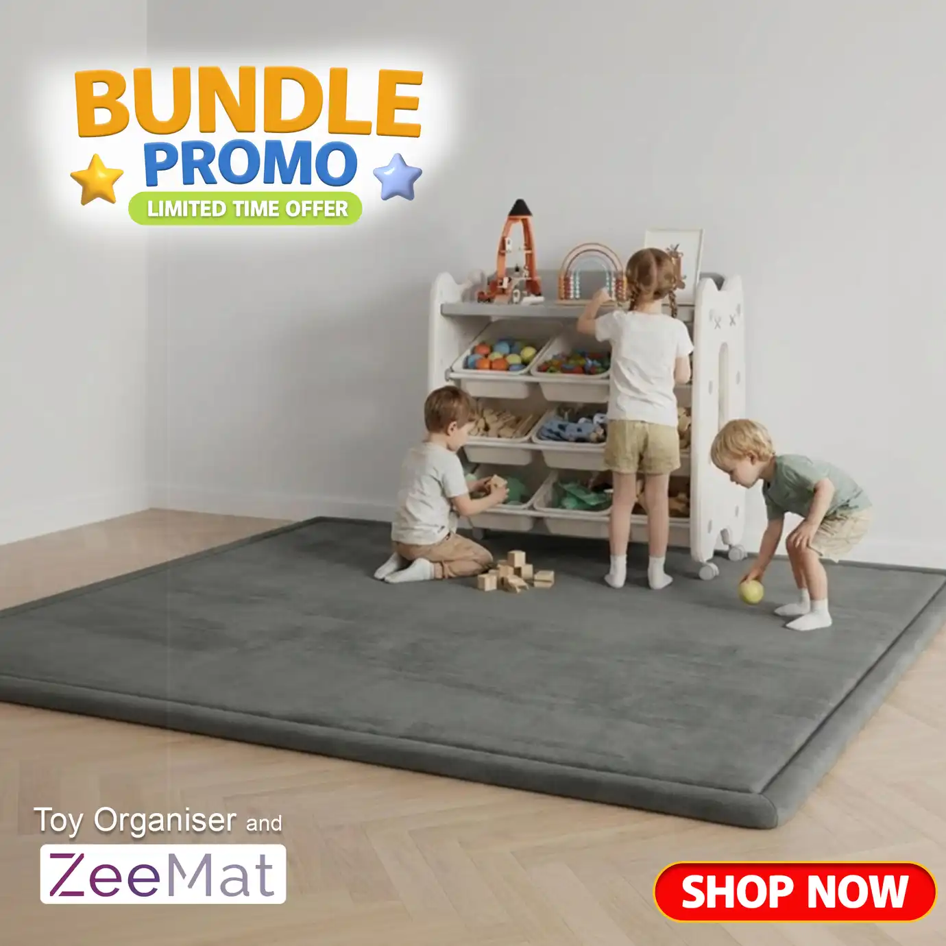 The ZeeMat provides a soft, cushioned 35mm memory foam play surface - perfect to place underneath your toy storage unit. Non-toxic, spill resistant, easy to clean, and non-slip. Protects your floors and keeps little ones safe during playtime.